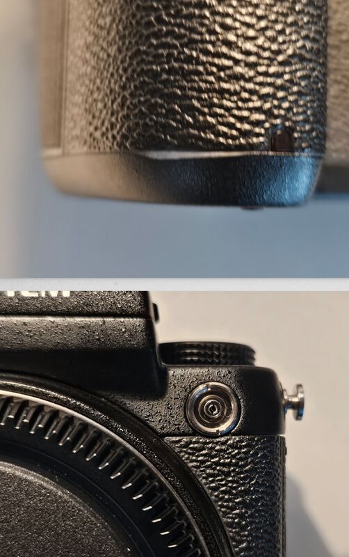 Целият комплект както обектива и адаптера така и тялото , са пазени и не са изтървани , тялото има две леки забележки , които съм снимал (леко паднала боя на грипа и липсваща капачка за външната светкавица)