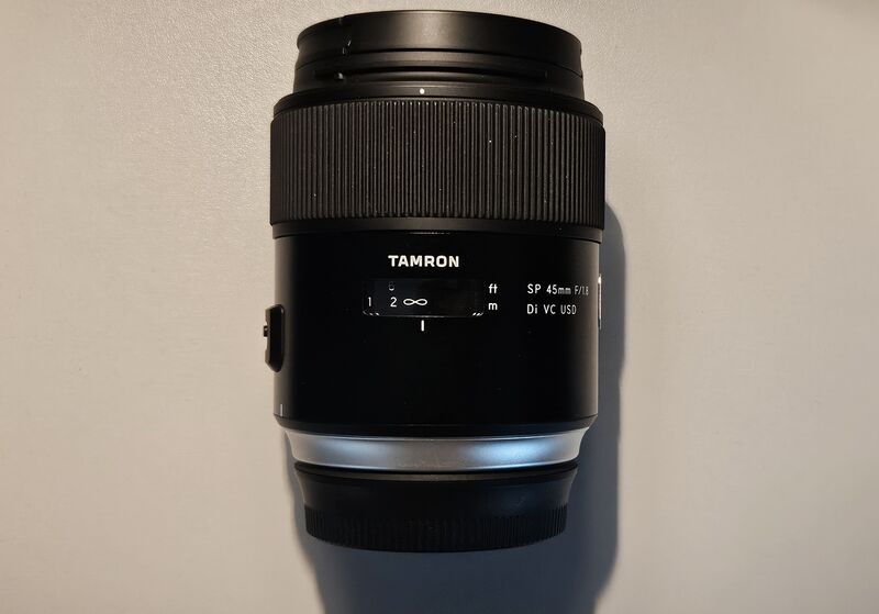 Обектив Тамрон 45mm f1.8 изклютително добре изработен с метален корпус и сенник в комплект с двете капачки както и кутия с канонски байонет както и автофокусен Viltrox адаптер EF-GFX .