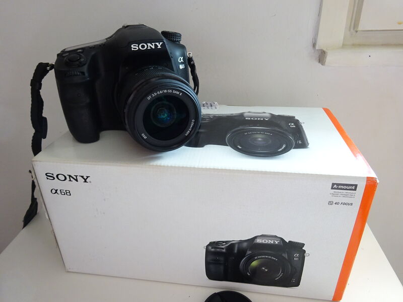 В комплекта: оригинална кутия и книжка, тяло а68, китов обектив 18-55 мм, ремък, оригинална батерия.