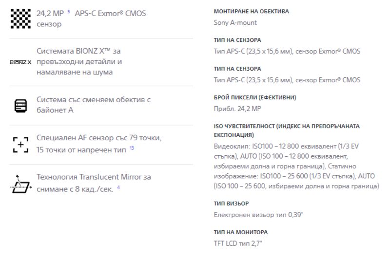 Описание и характеристики: www.sony.bg/electronics/smeniaemi-obektivi-fotoaparati/ilca-68-body-kit