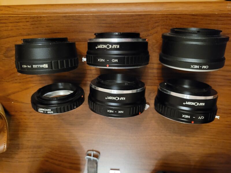 - 7 адаптера към Sony E mount към: m39, m42, Pentax K, Olympus OM, Minolta MD, Contax/Yashica, Nikon F