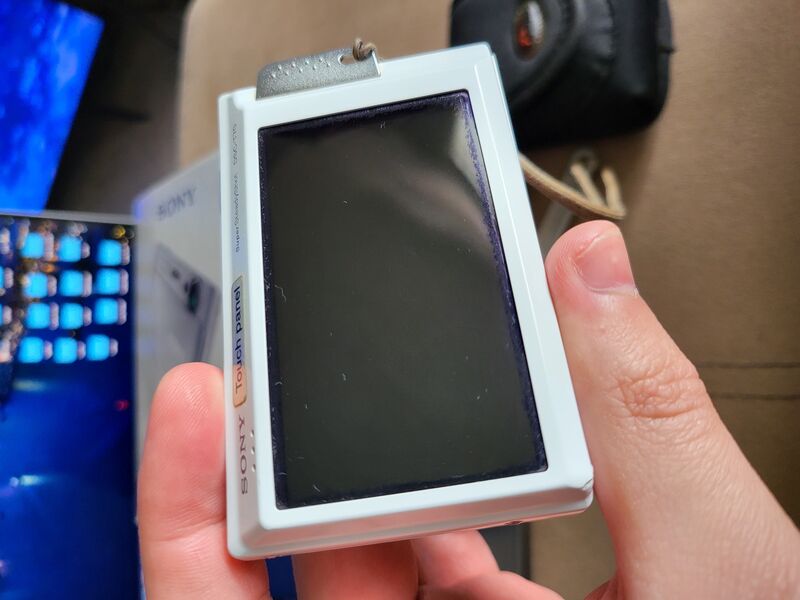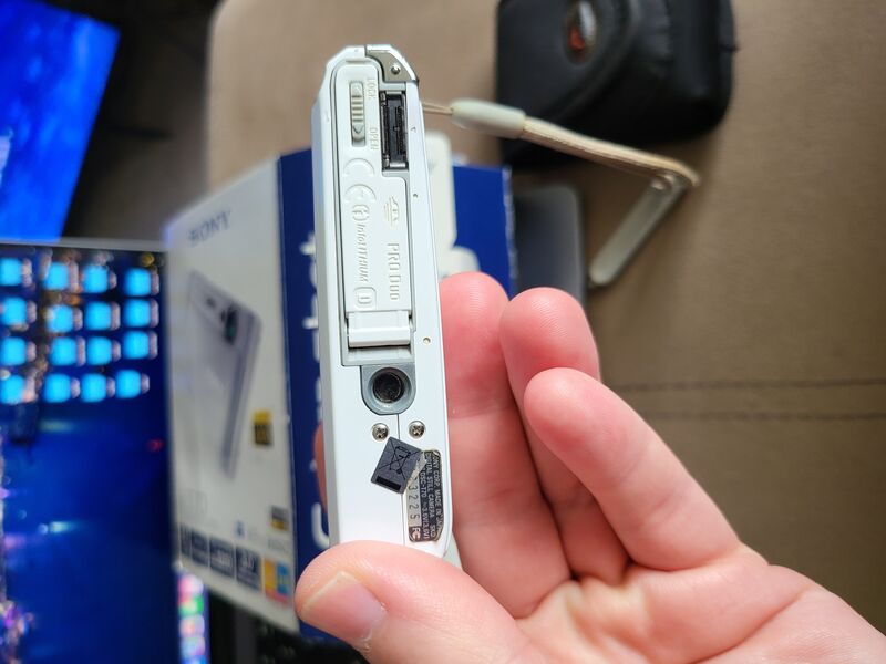 Дава се с кутия, оригинално зарядно, юсб и тв кабел, малка чанта и карта памет (за около 600 снимки, работи с Memory stick pro duo карти памет).