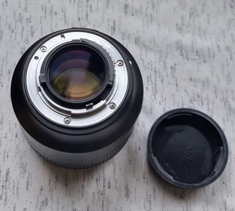 Продава се този доказано добър портретен обектив в общо отлично функционално и добро визуално състояние с някои нормални до малко по-видими козметични следи от ползване по корпуса и сенника - една зона с протриване на боята по корпуса, леко нарушение на най-предният декоративен ринг и захабяване по "златното" покритие на основния надпис - никакво влияние. Запазена оптика с изключение на някоя друга мъничка прашинка под лещите - отново без влияние. Заедно с 2 капачки и сенник.