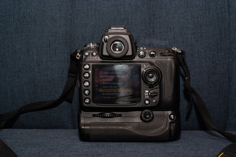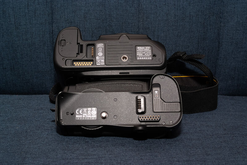 Перфектен апарат на нищожно малко кадри с батериен грип .Стара машина направена като танк и работеща безотказно.Който е запознат знае какво взима.Към апарата има оригинално зарядно и батерия.Грипа също е оригинален и върви само с приставката за En-el-3 батерията.