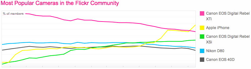 Най-използваният фотоапарат във сайта flickr е не друг, а iphone! Той изпреварва ДСЛР-ите на Канон и Никон, ето вижте тази графика: