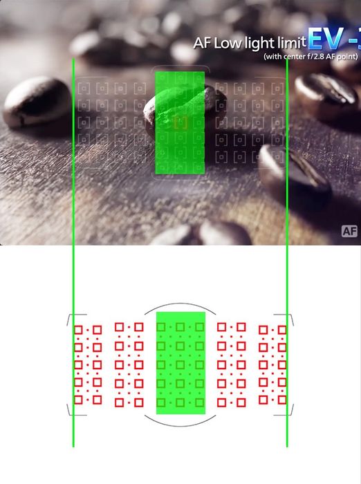 "It features a new 61-point High Density Reticular AF II system with 41 cross-type points that expands the AF area approximately 8.6% in the top and bottom of the central AF area, and approximately 24% at the top and bottom of the peripheral frame."