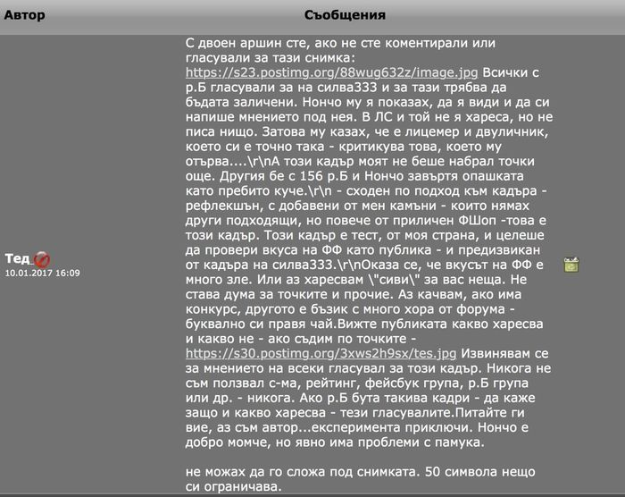 Сметнах въпроса за приключен с изтриването на мненията ми под снимката и последното лично съобщение. Нямам намерение да споря с някой, който се е самонавил за собствено правораздаване, но повечето му изяви били "пародия и бъзик" и видимо не различава категориите във форума. После се оказа, че монологът от другата страна е продължил да ме намесва: