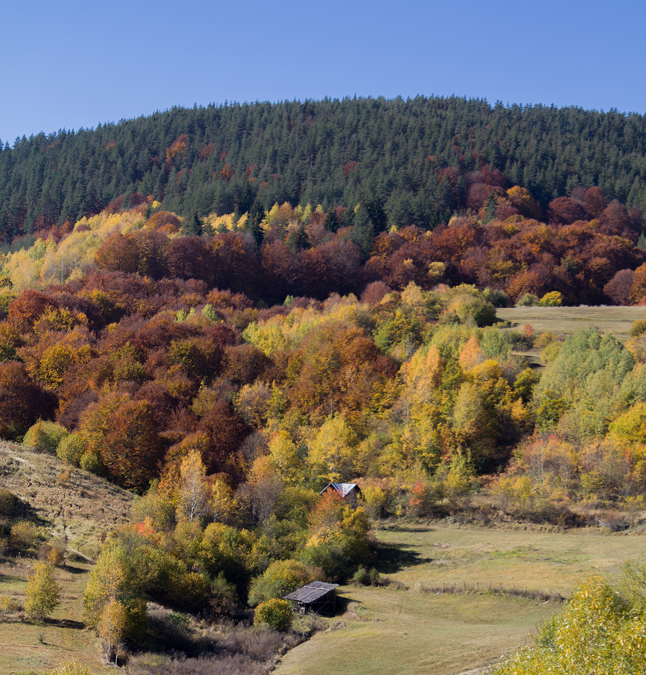 Като цяло, тази есен не беше толкова цветна. Първо ранния сняг съкрати драстично периода на златната есен там където падна - на Витоша след снега склоновете изведнъж потъмняха над една определена надморска височина, съвсем малко над Драгалевци, Бистрица и Железница, а после там бързо опадаха листата. Добре че успях да полетя малко над тях в краткия прозорец от горе-долу само една седмица още в средата на октомври когато беше шарено. В по-ниското пък и доколкото виждам и в Родопите, въобще където не стигна снега, заради по-влажното време си стоеше зелено до началото на ноември, и което е тъпото опадваше често почти зелено. Ето едно директно сравнение което мога да направя спрямо миналата година на склоновете около Асенова крепост и което мисля е показателно за тази есен въобще: