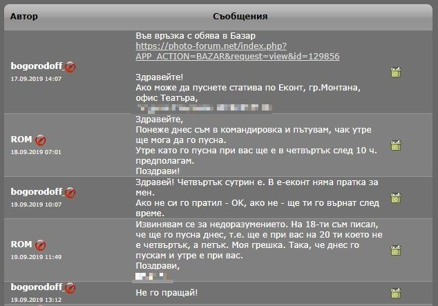 Нямах намерение да копирам личните съобщения, но не ми оставяте друг избор. Ето и хронологията, за да прецените кой е крив и кой прав и да имате едно на ум когато въпросния "колега" поръча нещо от вас.