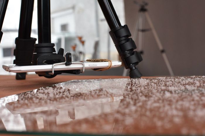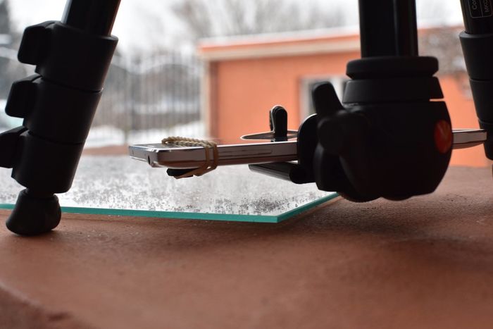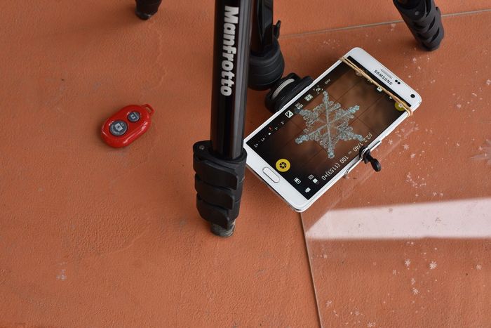 За целта използвам съкло на което падат снежинките, статив за телефона и дистанционно с което до снимаме.