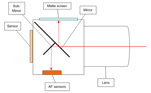 - Светлината преминава през обектива и се отразява през полупрозрачно огледало (за нуждите на обяснението не важно точно пентапризма ли е или нещо друго) към окуляра през друго огледало под първото се отразява към сензорите за АФ. Електрониката на апарата връка системата за настройка на фокуса в дна или друга посока и докато сензора каже Всичко е ОК. Принципно това е сравнително проста систеза с Обратна Връзка и всичо е ясно нищо не зависи от обектива, така че ако механично сензорите са настроеникато трябва и системата работи коректно с един обектив, би трябвало да работи нормално със всички други обективи, както и на всички фокусни разстояния със съответния обектив и не би трябвало на 24мм да е ОК а на 70мм да не е