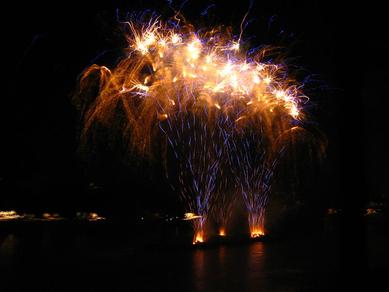 Светлинното шоу на един от няколкото понтона разположени на река Рейн в Базел на празника на Швейцария