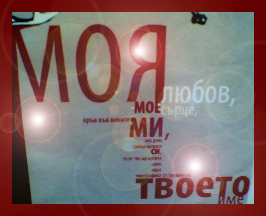 МОЯ Любов, МОЕ Сърце, кръв във вените МИ, ако днес срежа китките СИ, то от тях ще изтече само една типографика от буквите на ТВОЕТО ИМЕ!!!