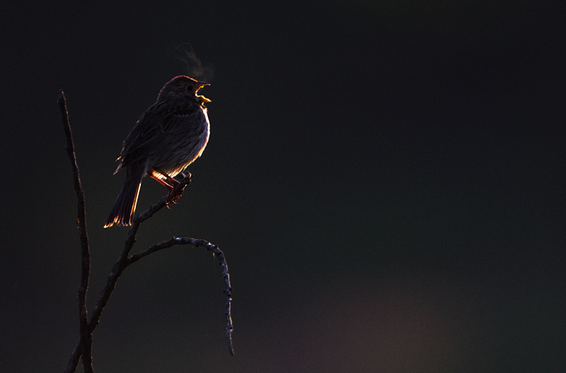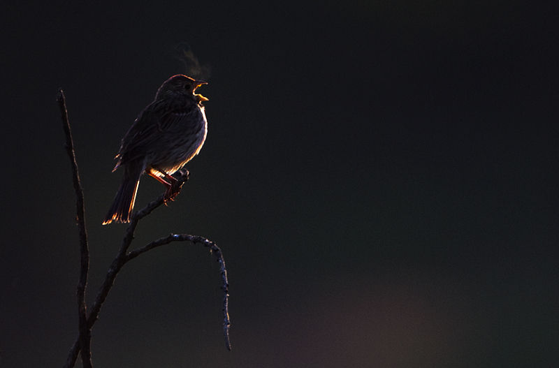 сива овесарка, посрещаща деня с песен в една мразовита сутрин