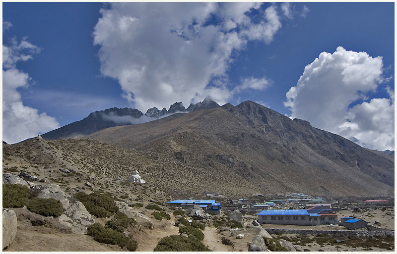 Върхът се извисява над хималаиското село Dingboche-4300m.През пролетта,когато е правена снимката, на тези височини сняг няма. Непал,Хималаи,2010