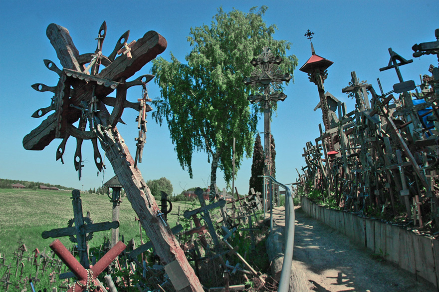 Литовците са горди с посещението на папа Йоан - Павел ІІ, който е благословил мястото. Казваха ми, че по съветско време директорите на местните колхози (странно ми беше, но така ми обясниха - на директорът на стопанството, не на полицията) постоянно са получавали заповеди "отгоре" за унищожението на хълма, които регулярно са се изпълнявали - с милиция и армия, възпирайки съпротивата на населението. Въпреки това, местните са възстановявали кръстовете през нощта, а директорите умирали от странни болести. Единствено последният съветски колхозен директор не е изпълнил заповедите от Москва и е останал жив.