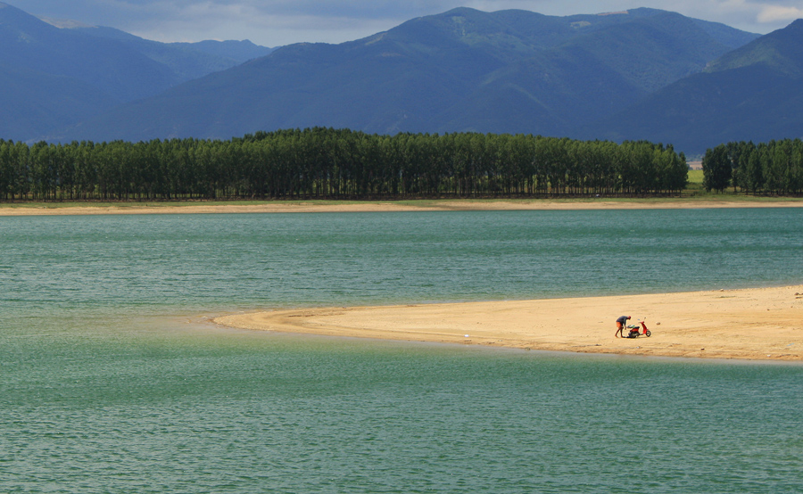 The Red Scooter on the Bank of Corpinka under the Peak of Three Heads