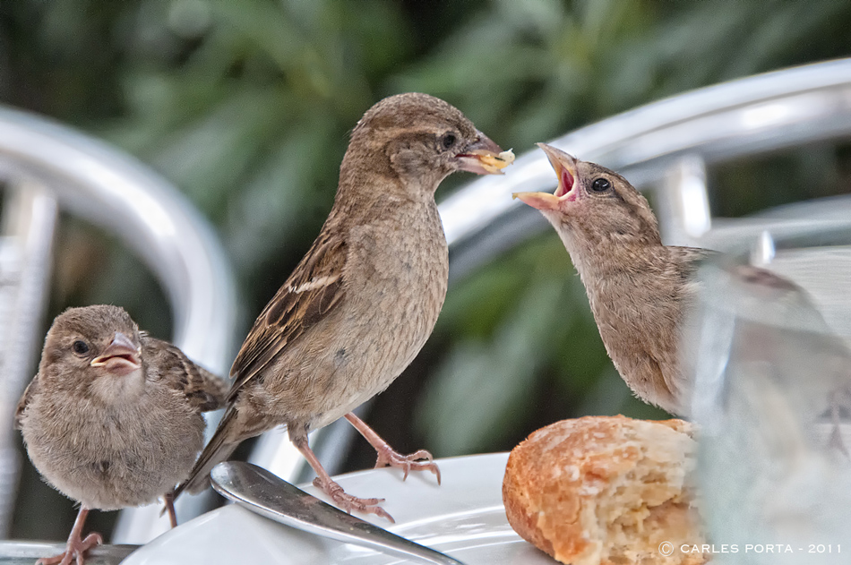 Този уикенд, а на терасата на един бар споделяне на някои тапас, имах приятна изненада: хората, които са били на масата до наляво и отляво останки от храна на техните плочи, а след това женски птици и тяхното потомство бяха минути на присъствие и да ни даде една демонстрация на това как птиците хранят своите малки. Бях щастлив да бъде придружена от фотоапарата ми, но от гледна точка не е най-подходящ за този вид фотография. Ето и резултатите, така че можете да се насладите.