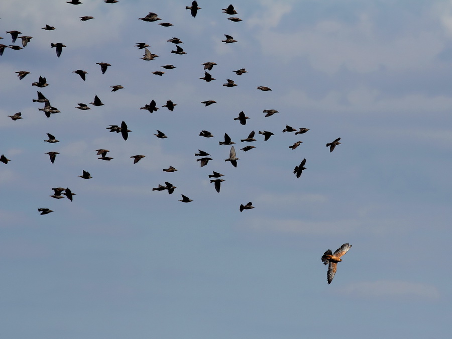 Вечерна ветрушка, атакувана от ято скорци