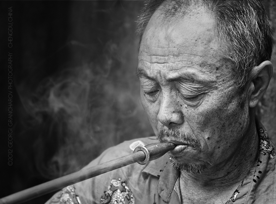 Chinese man, smoking a traditional pipe ( over 1m long! ) - Chengdu, China