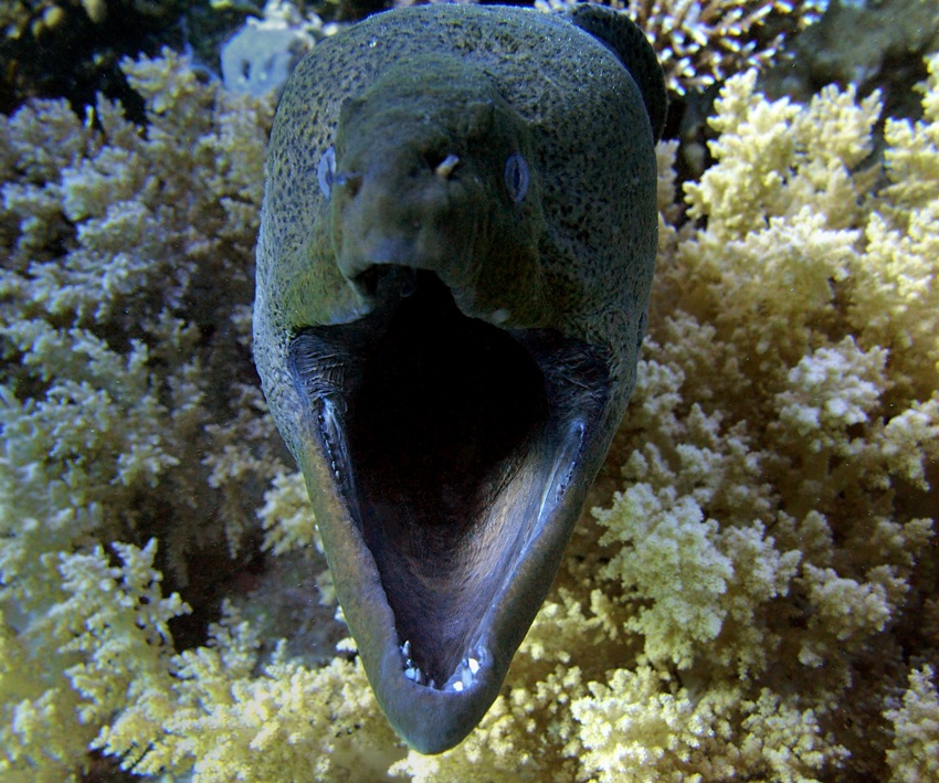 Мурената е хищник, който ловува нощем. Това дава смелост на водолазите да се доближават на близка дистанция през деня. Единсквения начин да се освободиш от тази риба, ако те захапе е да изплуваш на повърхността. Тази на снимката е с диаметър около 25 см и дължина /може би/ 2,5 метра - сериозен представител на вида си! Снимката е от Червено море, дайв сайт Shark & Yolanda, дълбочина 18 м.