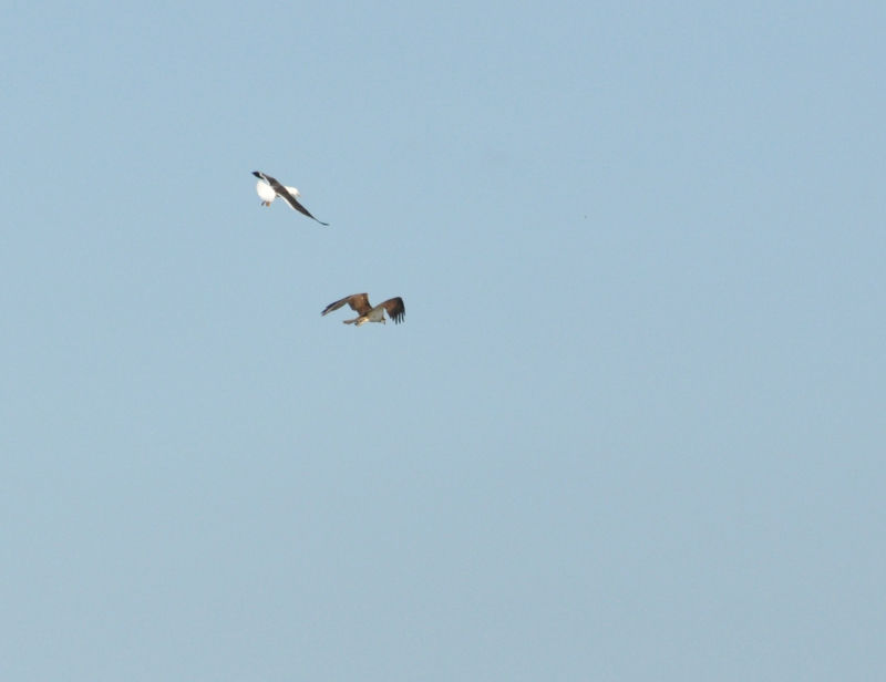 Малка черногърба чайка преследваща орел рибар