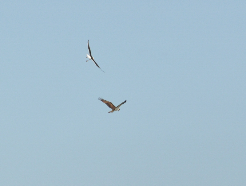 Малка черногърба чайка преследваща орел рибар