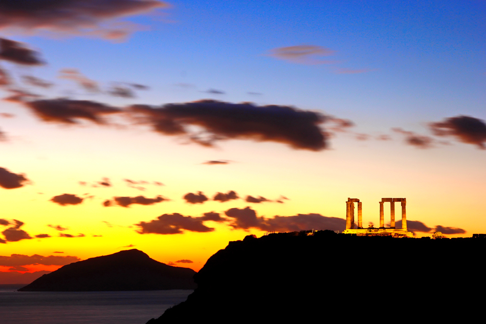 Залезът над Егейско море оцветява небето и очертава силуета на известния храм на Посейдон