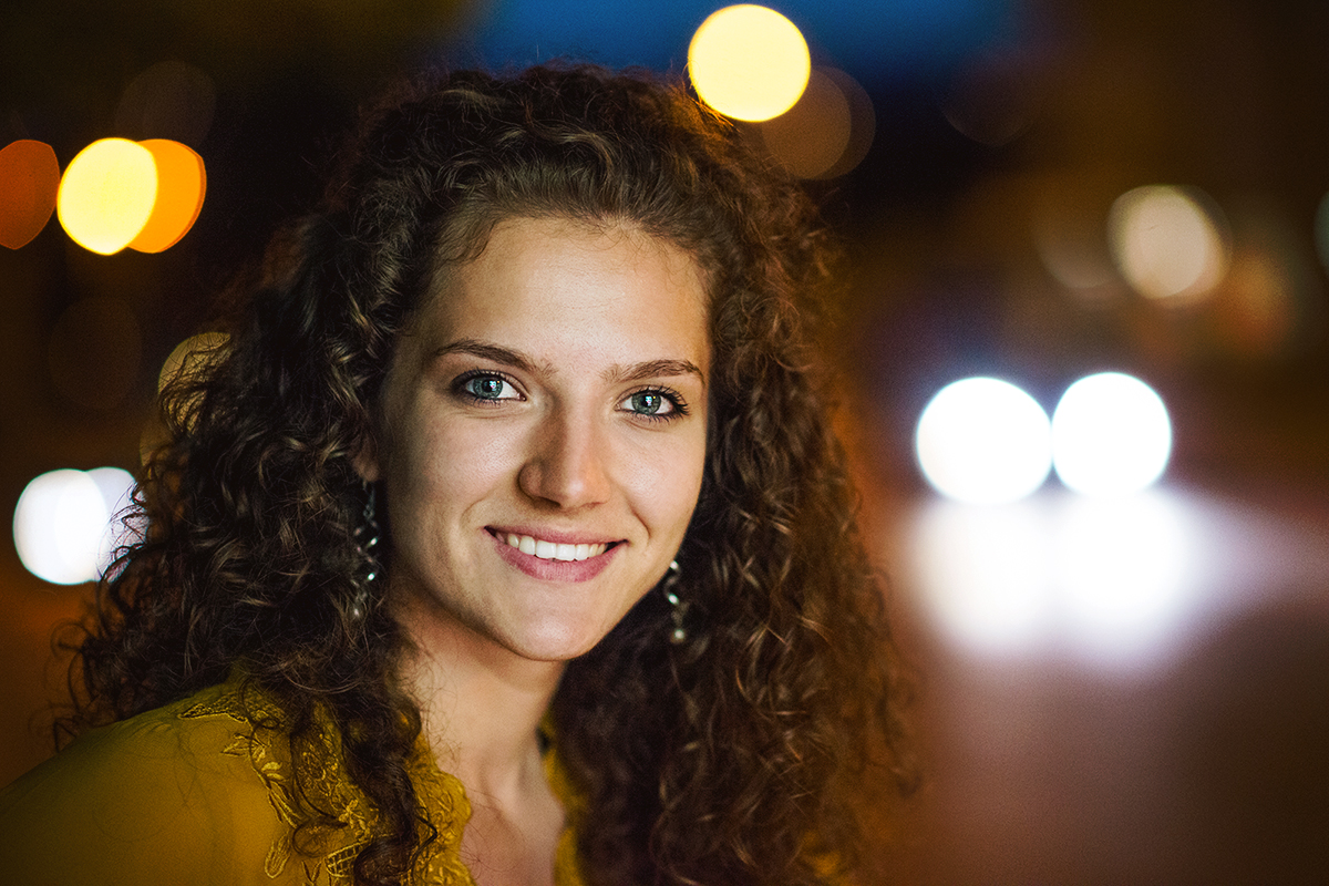 Снимката е без светкавица. Девойчето е осветено от светещо табло на автобусна спирка.