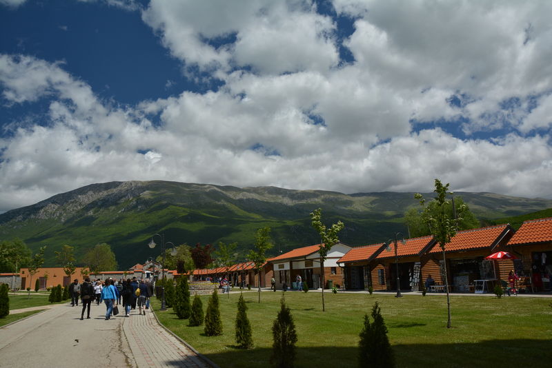 Изглед към двора на "Свети Наум' и планината Галичица зад него.