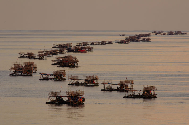 Край бреговете на Мианмар хиляди рибарски лодки се връзват една към друга образувайки редици често с дължина по няколко километра. По този начин си помагат при силните течения и бури.