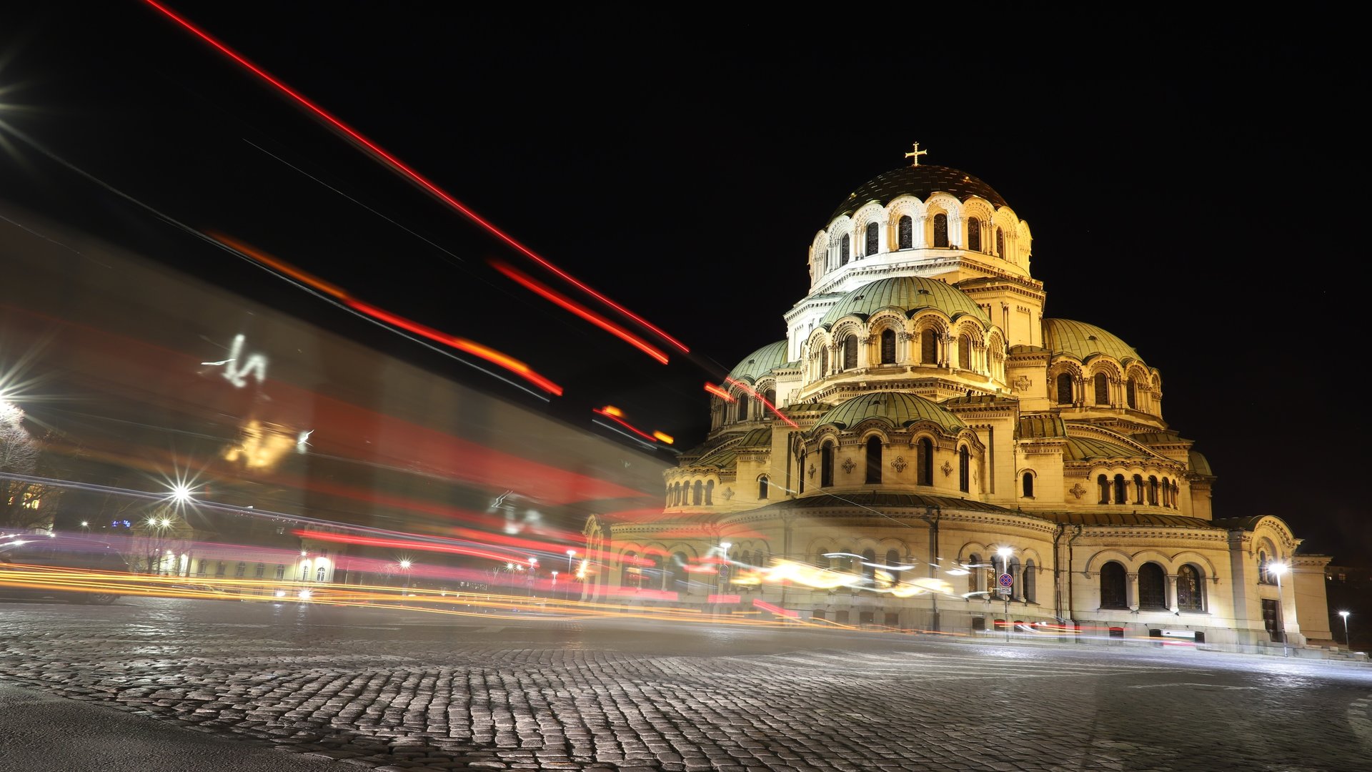 Нощна фотография на катедрала Александър Невски в София