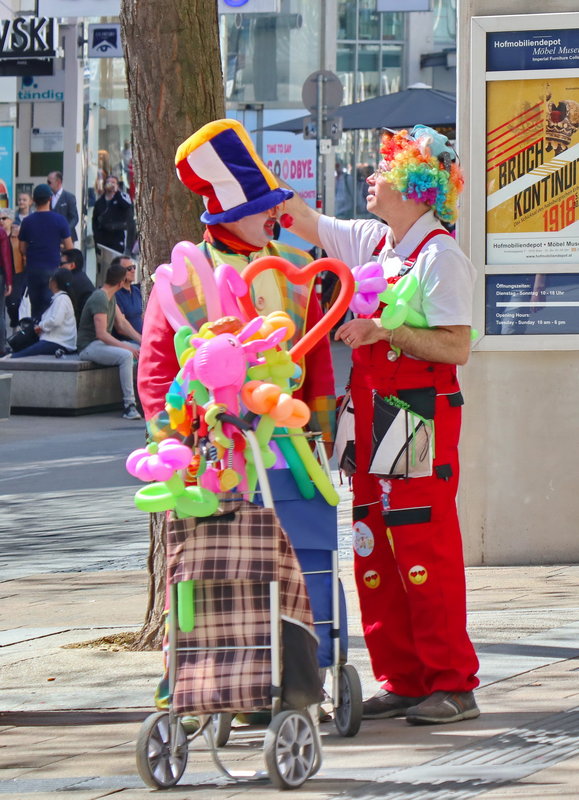 Двама забавни клоуни се подготвят да велелят минувачите и най-вече децата. Последни приготовления, минути преди за започнат отговорната си работа.