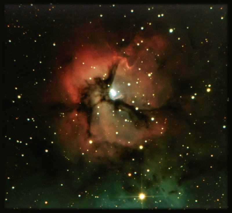 The Trifid Nebula (catalogued as Messier 20 or M20 and as NGC 6514) is an H II region located in Sagittarius. It was discovered by Charles Messier on June 5, 1764. Its name means 'divided into three lobes'. The object is an unusual combination of an open cluster of stars; an emission nebula (the upper, red portion), a reflection nebula (the lower, blue portion) and a dark nebula (the apparent 'gaps' within the emission nebula that cause the trifurcated appearance; these are also designated Barnard 85). Viewed through a small telescope, the Trifid Nebula is a bright and peculiar object, and is thus a perennial favorite of amateur astronomers.