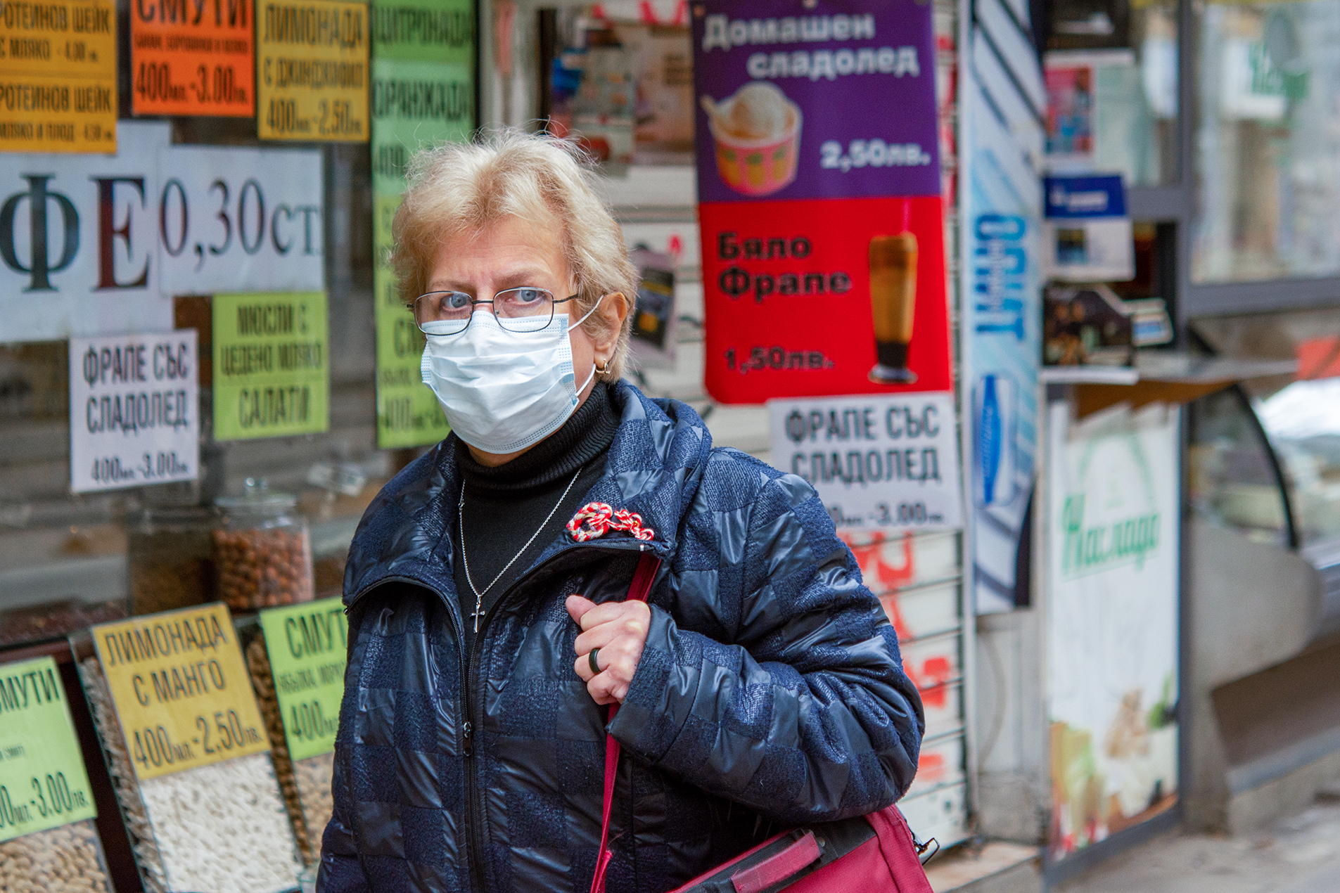 Жена с предпазна маска на ул. Алабин в София