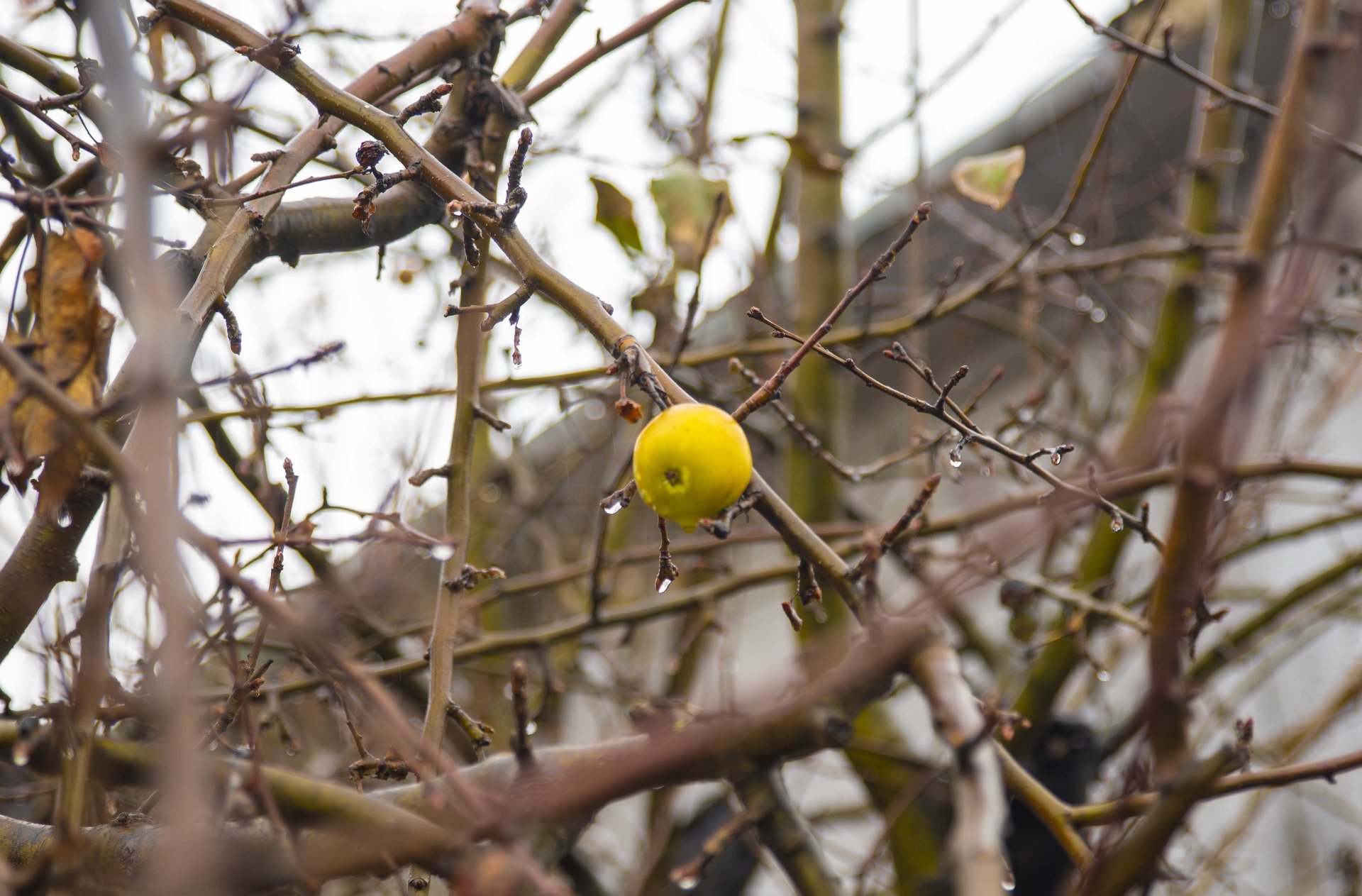Една ябълка която остана на дървото през студените есенни дни