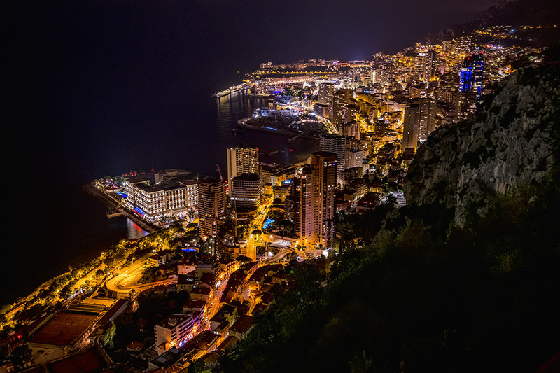 Монако през нощта видяно високо от Алпите