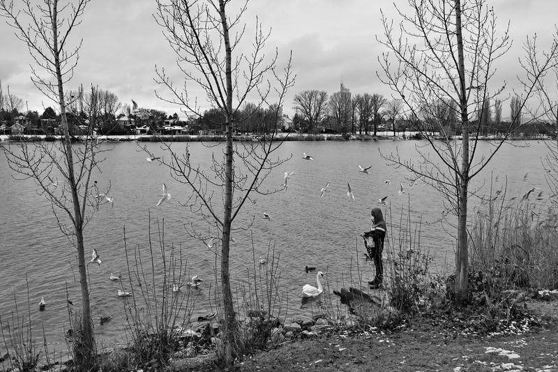 Студеното време, вятърът, снегът и влагата не попречиха на този човек да нахрани летящите приятелчета!