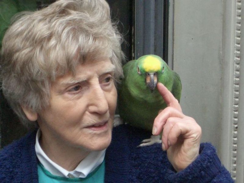 Edna suvsem sluchaina jena,koiato stoeshe s tozi papagal na neia s chasove v centara na Zurich
