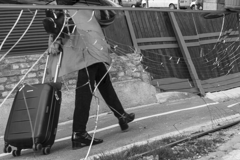 Старо огледало захвърлено на улицата отразява забързания живот.