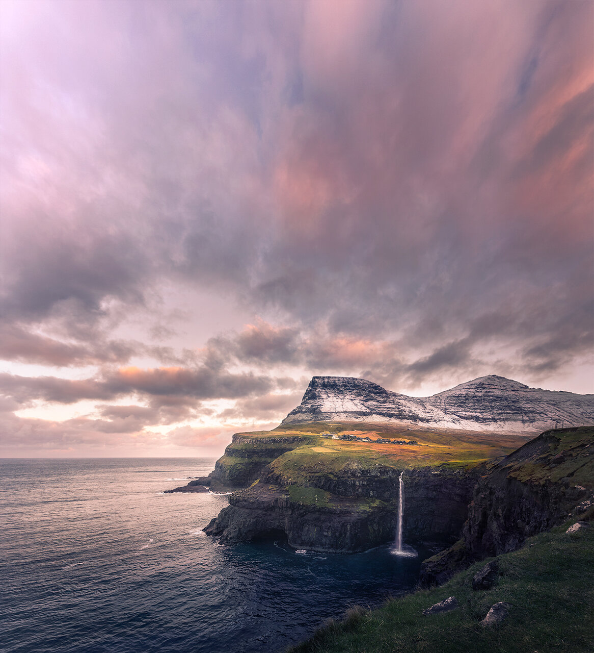 Изгрев от Гасадалур с водопада Мулафосур, Фарьорски острови Верторама