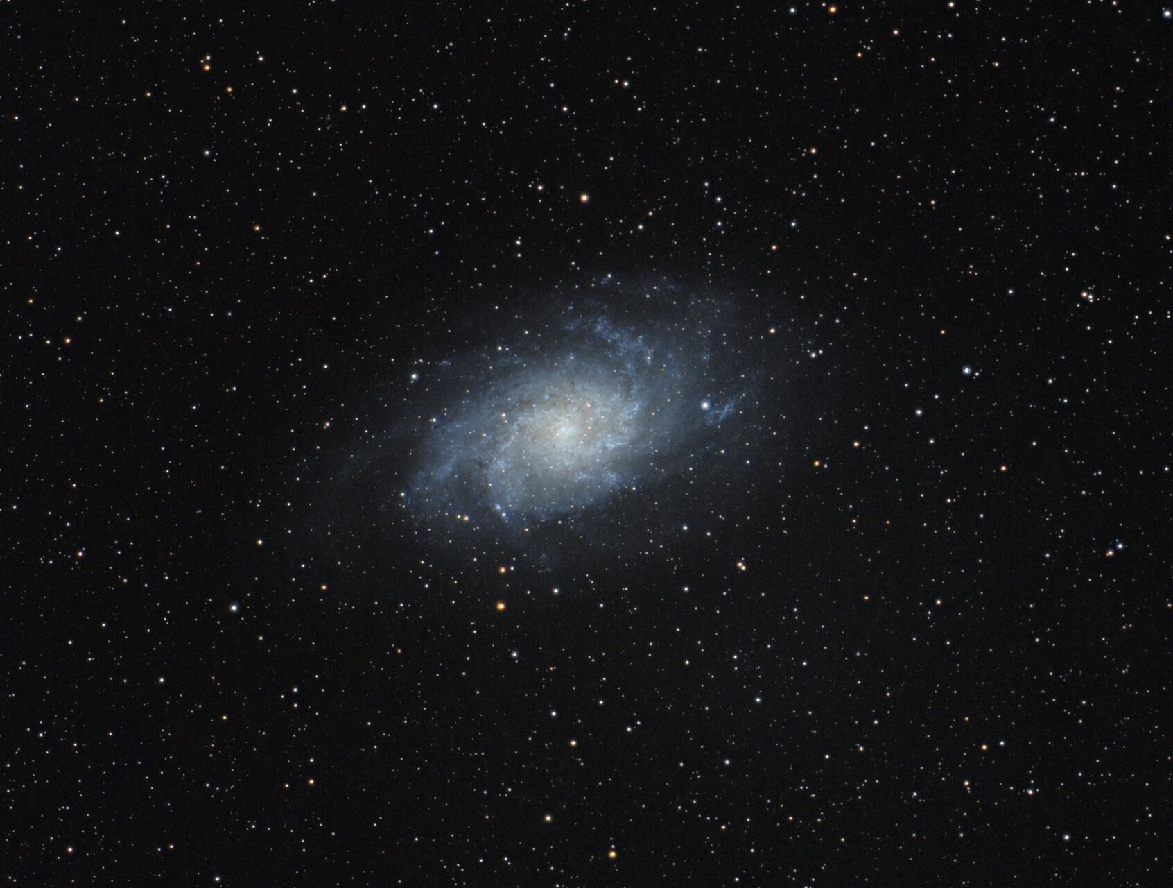 М33, известна още като Триъгълната галактика, е спирална галактика, разположена в съзвездието Триъгълник на разстояние около 3 милиона светлинни години от Земята. Тя е третият по големина член на Местната група галактики, след Андромеда (М31) и Млечния път. С диаметър около 60 000 светлинни години, М33 е по-малка от нашата галактика, но съдържа милиарди звезди и множество активни зони на звездообразуване, като прочутия регион NGC 604. Тя е богата на междузвезден газ и прах, което я прави обект на интензивни астрономически изследвания. Благодарение на близостта си и яркия си вид, М33 е една от най-известните и красиви галактики, видима дори с бинокъл при добри условия.