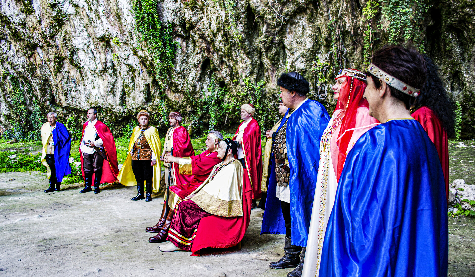 възтановка на историческо събитие в голямата пещера на скалите в Мадара