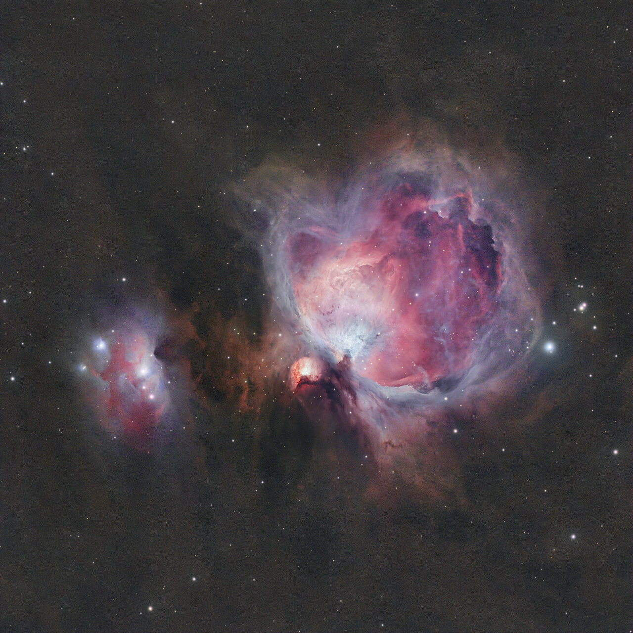 В центъра ѝ се намира звездният куп Трапециум – група от много горещи и масивни млади звезди, чиято силна ултравиолетова радиация кара околния газ да свети. Цветовете – от розово и червено до синьо-зелено – идват от йонизиран водород, кислород и други елементи. Вътре в мъглявината се откриват протозвезди, прашни дискове, струи материя и тъмни „стълбове“ от газ, които показват как гравитацията и радиацията оформят нови слънца и планетни системи.