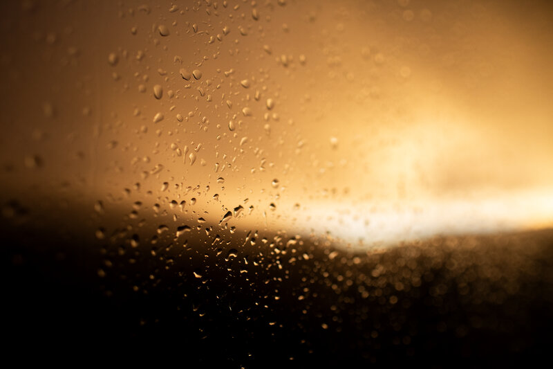 Като деца пред рецитал са чакали дъждът да почне, и изведнъж градът е цял във капки весели и сочни. Градът от банята излиза и капки от носа му капят. Надниква слънце, ниско, близо – децата за да си отхапят. Градът спокойно се суши и като котка се протяга. Денят, ухилен до уши, не иска още да си ляга. Дъжд – слънце, слънце, слънце – дъжд, дъги с пижамени райета. Последно, още по веднъж, и ще се свечери небето. Мария Донева