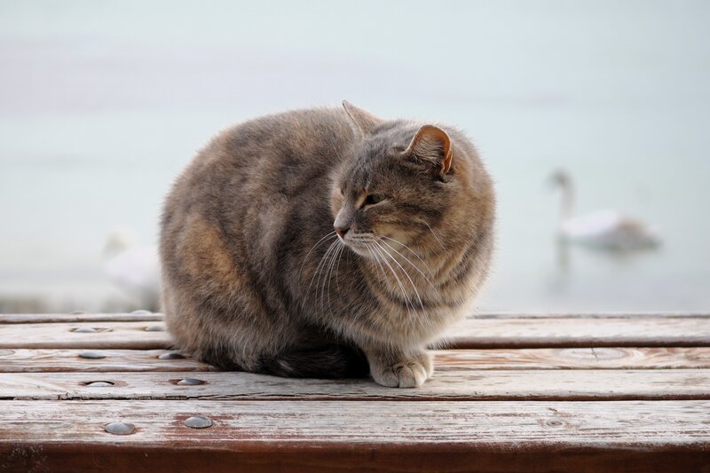 Котка на фона на лебед