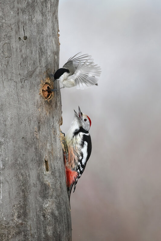 Среден пъстър кълвач гони синигер