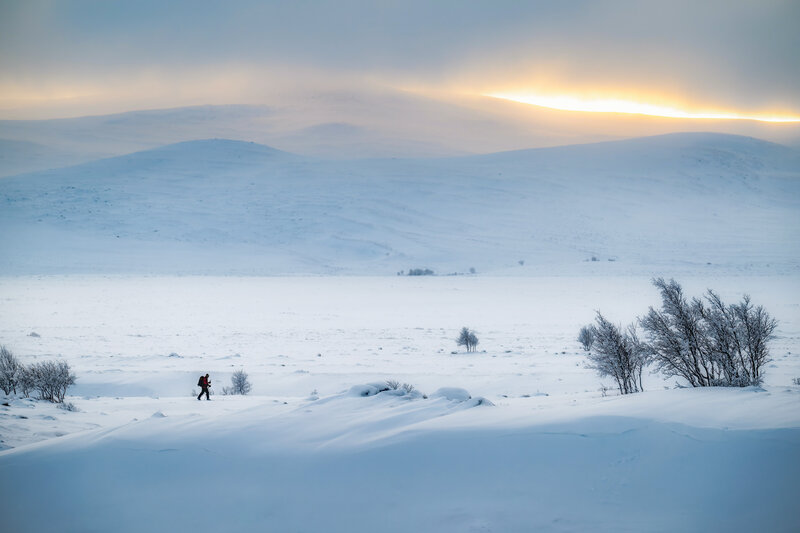 Норвегия -20 градуса и докато за някои е студ и се крият на топло ,за други е обикновен ден и разходката е нещо нормално. Това е един от рейнджърите които работят към резервата и дават всекидневна информация. Интересното е че в този ден той е в почивка и въпреки това е навън. Човекът в снимката е просто част от невероятните пейзажи които видях на тази експедиция.