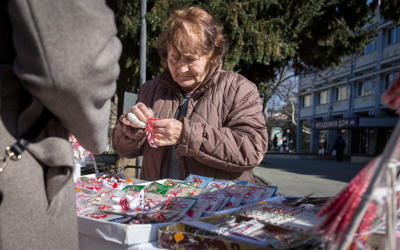 Една от няколкото баби продаващи мартеници в Пазарджик на площада на Тортата.