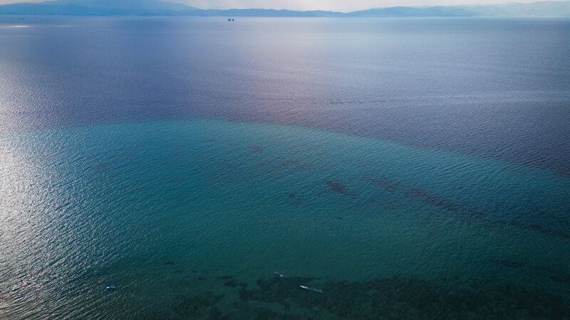 Безкрайната водна шир се прелива от синьо към зелено, създавайки усещане за дълбочина и спокойствие. Малките лодки се губят в пространството, а хоризонтът разделя реалното от безкрая. Миг на тишина, в който морето говори без думи.